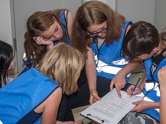 In several workshops on the subject "Bauhaus tour for schoolchildren", young people collected statements, wishes and visions regarding the new concept for a schoolchildren's tour. They developed text fragments for tours under the headings "A crazy night in the BAUHAUS", "The BAUHAUS treasure" and "Mysterious happenings in the BAUHAUS". In small groups, the young people made up quiz questions that were subsequently tested by other groups and evaluated according to degree of difficulty and fun factor. In a next workshop the children's preparation work and materials flowed into an interactively designed tour for schoolchildren. The advantage of the participative approach is that the pupils' wishes and opinions are incorporated directly into the development of the format. In addition, the methods from theatre and dance education employed at the start of the process facilitated a playful approach and a low-threshold, pleasurable study of themes relating to the Bauhaus. After several tests and subsequent partial revision, the interactive tours by Bauhaus researchers and Bauhaus experts emerged. Both tours have been part of the regular educational communication programme of the Foundation Bauhaus Dessau since January 2019. On the tours young people now find out in team or partner work, by means of their own research, something about design, modern architecture, building materials, colour design and multifunctionality. Activity sheets encourage varied, creative and playful interactions with the modern ideas of the Bauhaus, as well as independent discovery and invention.